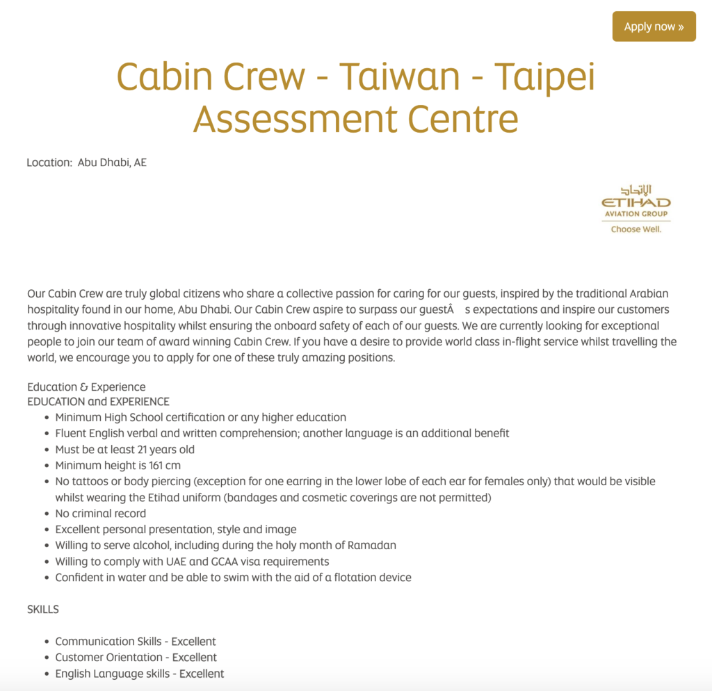 阿提哈德航空Etihad Airways上次來台灣招考,已經是2020年的事情了,沒想到在這個時間要到台灣來招募空服員啊(聽了就熱血起來)