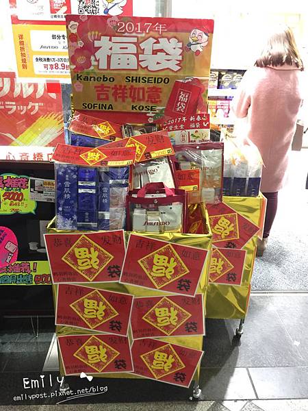 首先要來看福袋!日本藥妝店也會推出福袋耶~我倒是第一次看到!都是有名的化妝保養品牌,就擺在藥妝店門口,都很升火耶!像SKII、雪肌精人氣商品都有喔~
